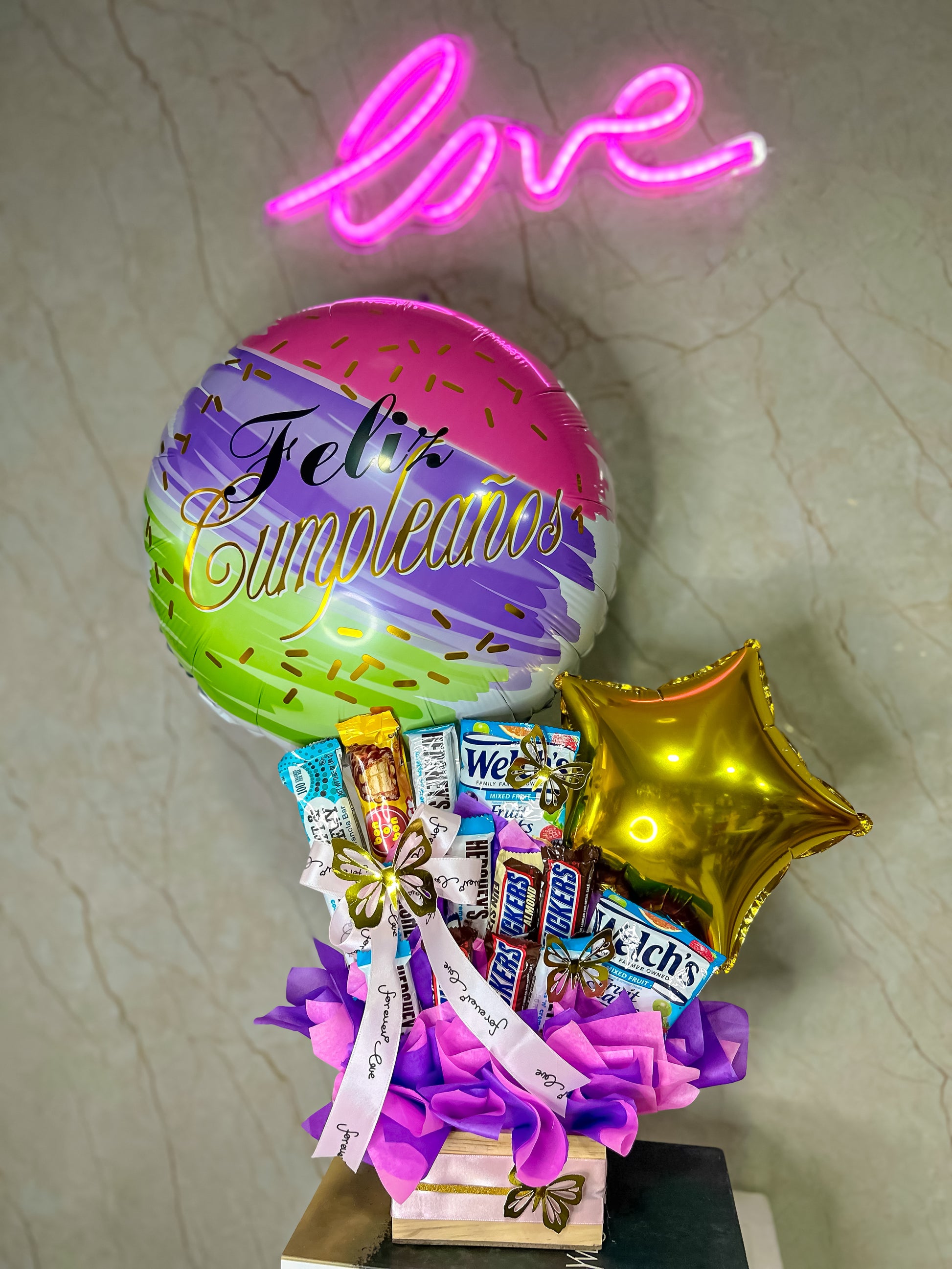 ¡Regala un día especial a esa Dama con este Arreglo! Inspirado en tonos morado y rosa, este hermoso ramo contiene deliciosos chocolates, mariposas y globos de cumpleaños para hacer de este día algo inolvidable. Un regalo perfecto para celebrar un momento especial.
