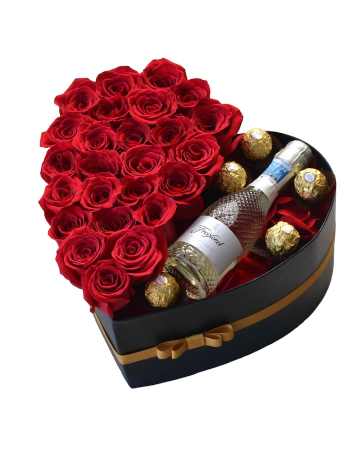 Este hermoso arreglo de rosas viene en una caja en forma de corazón y viene acompañado con una mini botella de champagne y chocolates Ferrero. Un regalo perfecto para demostrar tu amor y cariño a esa persona especial. Disfruten juntos de un momento romántico con la combinación perfecta de flores, bebida y chocolates deliciosos. ¡Sorprende hoy!